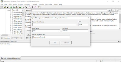 After building successfully go to Build>>Upload Categorizer, then enter Server Host Name, Port No., Username, Password and the Server Project Name which we want to upload on Content Categorization Server.